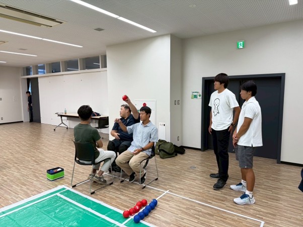 春江町総合型地域スポーツクラブ「UNITIVE291」を運営されている小林靖幸様のお話を伺い、実際にボッチャを体験させていただきましたので、ご報告いたします。小林さんは、障害の有無に関係なく誰もが楽しめる「ユニバーサルスポーツ」と呼ばれる競技を展開されており、坂井市において卓球バレーや手動車いすサッカーなどのチームを運営されています。私は、誰もが一緒に楽しめるユニバーサルスポーツの存在を知り、大変感銘を受けました。